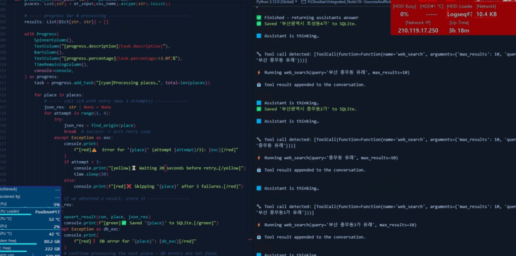 첫 번째는 복수의 인공지능을 활용한 작업에서 예상외로 불안정성과 예외 상황 발생이 많다는 것이다. 아래 모니터 캡쳐 처럼 시스템 상황과 작업 오류를 계속 확인해야 할 때가 자주 있었다. 이런 작은 프로젝트는 사람이 끼어들어서 때때로 살펴볼 여지가 있지만, 큰 프로젝트는 프로세스를 이런 식으로 통제하기 쉽지 않을 것이다. 물론, 나의 기술과 가용한 시스템 자원의 한계 때문도 있다. 그러나 크고 안정성을 요하는 작업에서 이런 문제에 대응하려면 가늠하기 어려울 정도로 엄청난 비용이 필요한 인프라가 있어야 하는 것은 확실하다.
