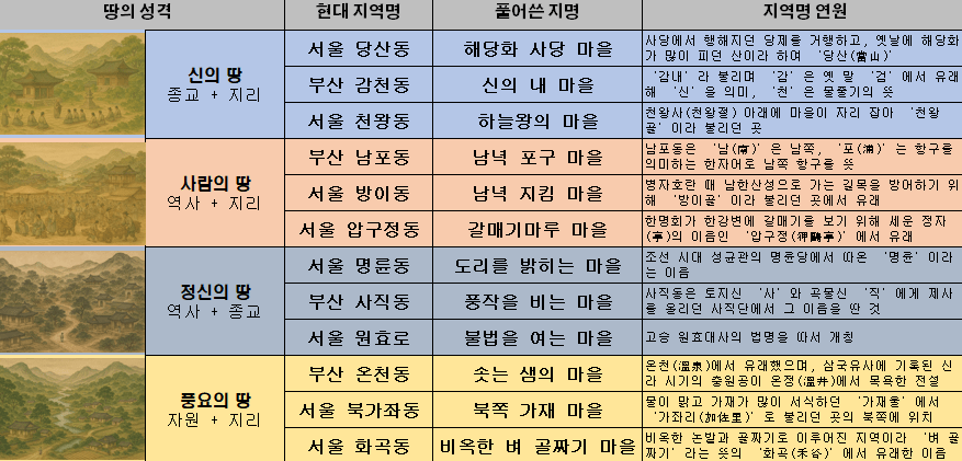 우선 내가 조금 아는(도메인 지식의 필요성!) 부산과 서울에 속한 동을 기준으로 수집된 결과를 요약해 보았다. 흥미롭게도 세 지표 이상에서 5점인 동은 없고, 두 지표에서 5점인 케이스가 소수 있었다. 두 지표씩 여섯 조합이 다 나오지 않고, 네 개의 조합이 나왔다. 조합별로 세 개 동을 뽑았다. 조합의 명칭은 내가 부여했다. 신의 땅, 사람의 땅, 정신의 땅, 풍요의 땅이 그것이다. 별도로 지역 특성에 기반해서 AI에게 그림을 그려보라고 했다. 작업 설계와 땅의 성격에 대한 해석을 제외하고는 모두 인공지능의 작업이다.